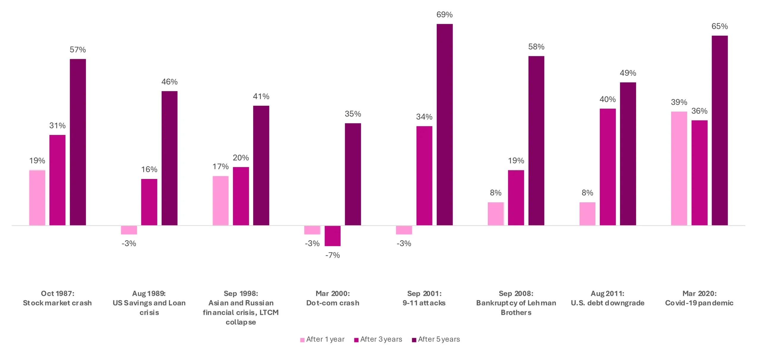 In moments of uncertainty, it can be grounding to look at how markets have responded to past crises. The accompanying chart illustrates the performance of a diversified 60/40 portfolio in the years following several major historical shocks — including the 1987 stock market crash, the U.S. savings and loan crisis, the dot‑com collapse, the September 11th attacks, the global financial crisis, the U.S. debt downgrade, and the COVID‑19 pandemic.