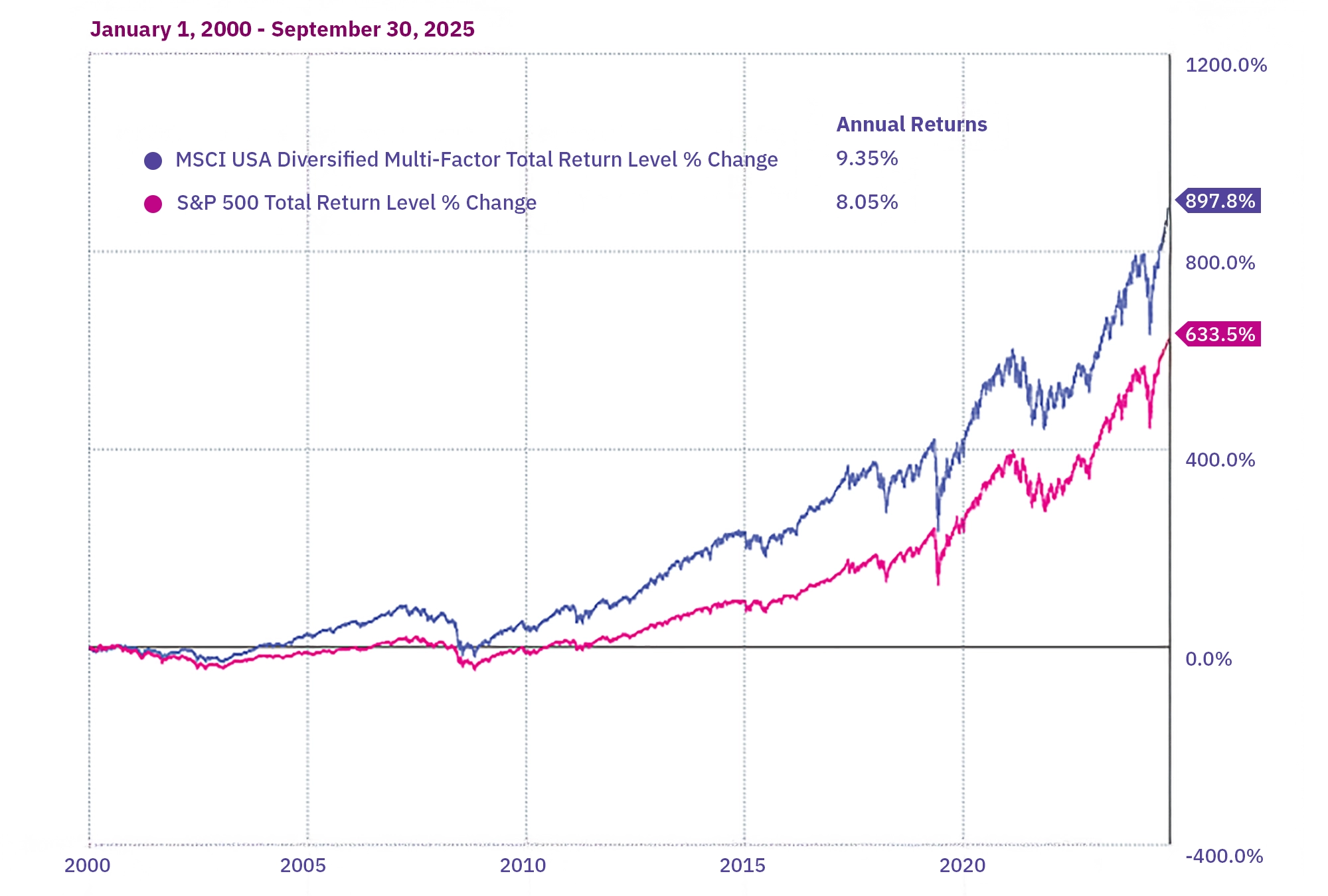 Source: S&P Global and MSCI. The MSCI USA Diversified Multiple-Factor Index is based on a traditional market cap weighted parent index, the MSCI USA Index, which includes U.S. large and mid-cap stocks. The index aims to maximize exposure to four factors — Value, Momentum, Quality and Low Size — while maintaining a risk profile similar to that of the underlying parent index. Past performance is no guarantee of future results. Actual returns may be lower. Index returns are not representative of actual portfolios and do not reflect costs and fees associated with an actual investment. Investors cannot invest directly in an index.