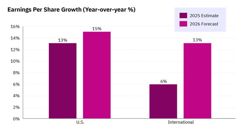 - Accelerating earnings growth: International companies are projected to finish 2025 with their fastest earnings growth since 2021, likely due in part to the aforementioned policy shifts.