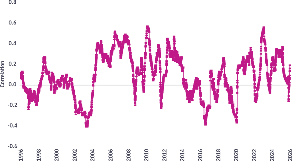 Correlation in monthly change (Jan. 1994 – Dec. 2025)