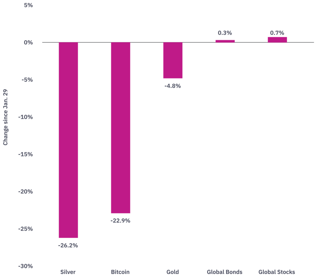 Just a few days before the Warsh announcement, we responded to the question: “Are gold and silver a good hedge right now?” by explaining that we don’t view gold and silver as investable assets, but rather as speculative assets which tend to be more volatile. Volatility, of course, means assets swing both up and down. Recently, that volatility has been to the upside. But that volatility can just as easily (and unpredictably) shift to the downside when sentiment changes — resulting in meaningful drags on performance.