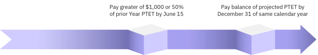 June 15 Prepayment | Required: Greater of $1,000 or 50% of prior-year PTET | Recommended: Same amount to avoid credit reduction |