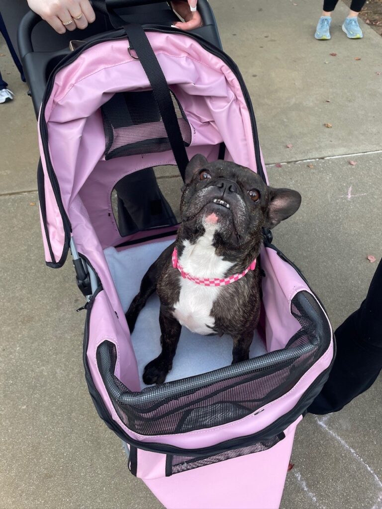 My Frenchie, Pinky, keeps me busy. She is my best friend and goes everywhere with me. I take her to my walking club and push her around in her pink stroller when she gets tired.